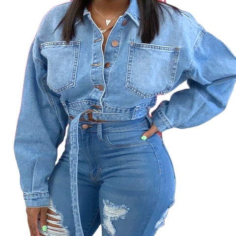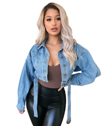 CL-551 Autumn Winter Hot Sales Loose Short Women's Denim Jacket With Belt Casual High Street Vintage Minimalist Women Jacket