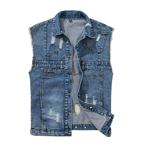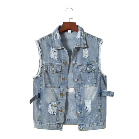 Women Perforated Denim Vest Women's Medium Length Vest Sleeveless Loose Korean Casual Trend Outerwear Cowboy Vest Jacket