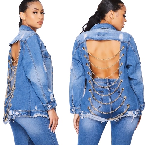 CL-539 New Design High Street Backless Frayed Mid-Length Jean Jackets for Ladies Fashion High Quality Chains Denim Jacket Women